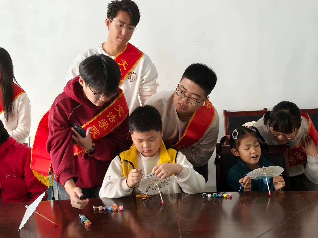 活动现场,学子志愿者通过讲解与实物展示,系统介绍油纸伞的千年历史、制作工艺及“团圆美满”的民俗内涵,并分享传统纹样与现代元素融合的设计思路。绘画环节中,亲子共同执笔,或勾勒江南水乡的温婉景致,或绘制萌趣活泼的卡通图案,亦有作品融诗意于伞面,展现创意与情感的交流。我院志愿者们全程提供调色与构图指导,及时解答疑问,现场氛围融洽,互动频频。